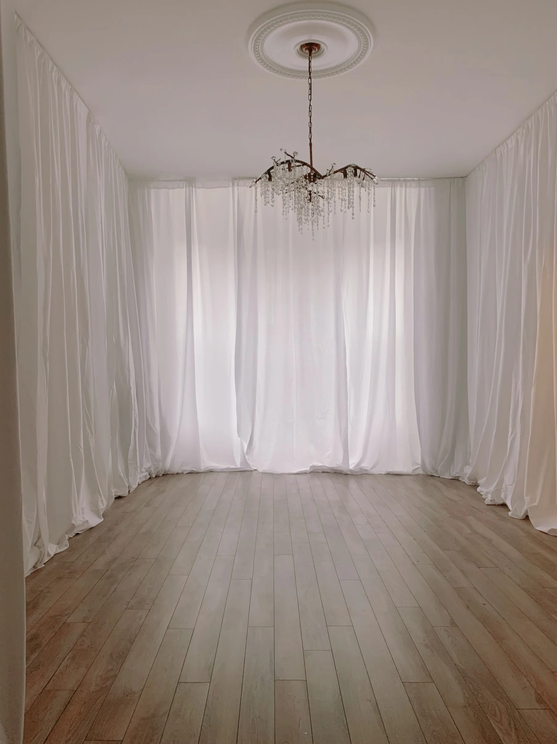There’s something calming about draping soft white fabric around an unfinished space. The simple act of hanging white drapery all around the living and dining room softened the edges of the renovation’s roughness and created a serene canvas. It gave the room a breath, a pause—a space that felt both intimate and expansive.